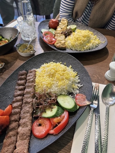 Als Extra-Gaumenfreude haben wir uns noch die traditionellen Schmorgerichte in Saucenform bestellt: Fsenjun Soße (mit Walnüssen und Granatapfel) und Ghormeh Sabzi (Kräutereintopf). Als süßer Abschluss wurde uns das Safran-Eis (mit einem Hauch Rose) ans Herz gelegt – wirklich sehr besonders.