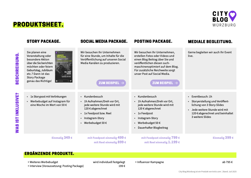 Nur bis Ende November erhältst du 100 € Rabatt auf unser beliebtes Social Media- & Posting-Package inklusive Reel. Bring dein Unternehmen genau dorthin, wo die Menschen in unserer Region nach Empfehlungen und Inspiration suchen. Der City Blog Würzburg ist die führende Plattform für Events, Geheimtipps und lokale Empfehlungen in Würzburg. Mit über 1 Million monatlichen Kontakten auf dem Blog und Instagram erreichen wir eine aktive Community aus Würzburg und Umgebung – authentisch, lokal und reichweitenstark.
