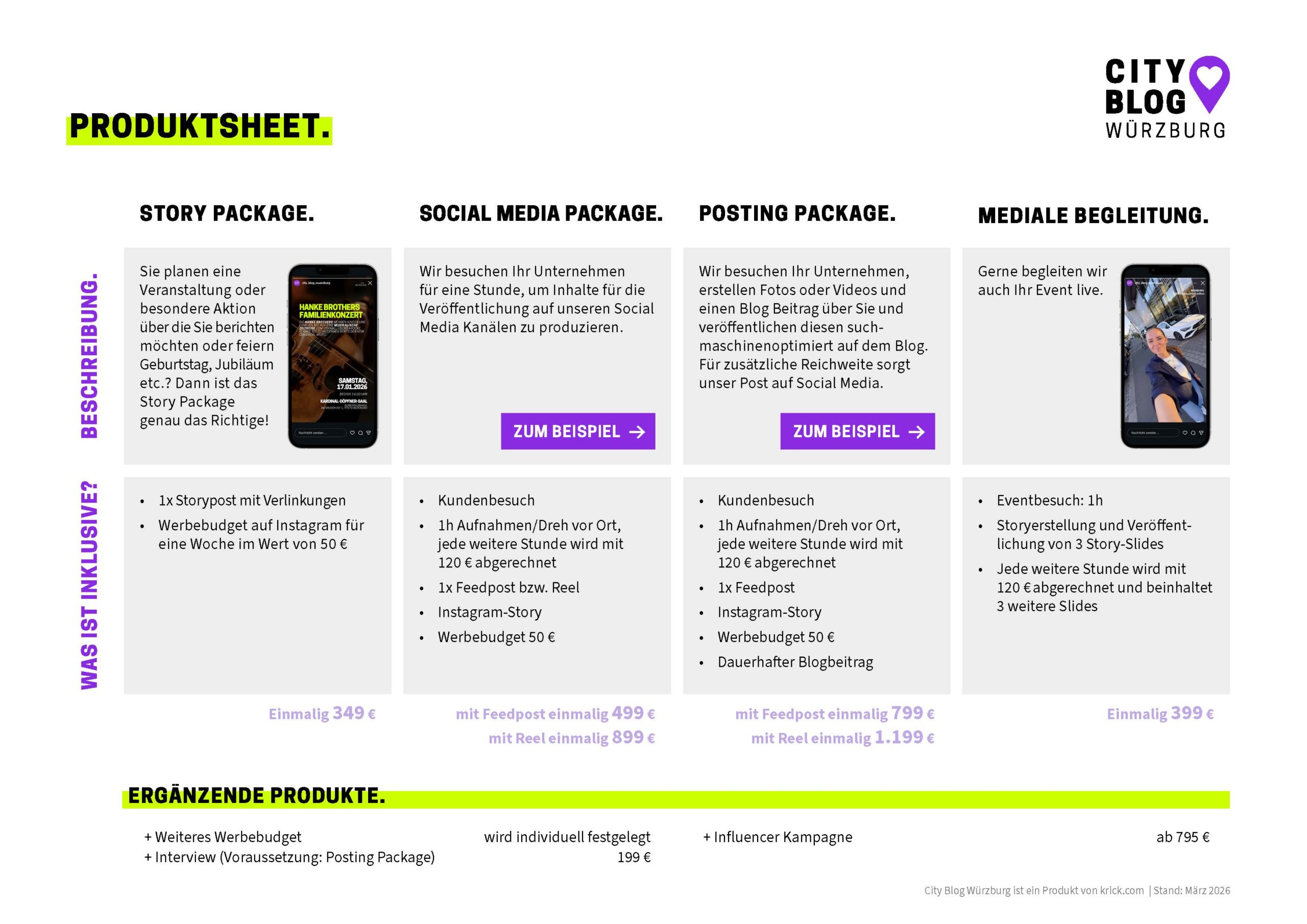 Bring dein Unternehmen genau dorthin, wo die Menschen in unserer Region nach Empfehlungen und Inspiration suchen. Der City Blog Würzburg ist die führende Plattform für Events, Geheimtipps und lokale Empfehlungen in Würzburg. Mit über 1 Million monatlichen Kontakten auf dem Blog und Instagram erreichen wir eine aktive Community aus Würzburg und Umgebung – authentisch, lokal und reichweitenstark.